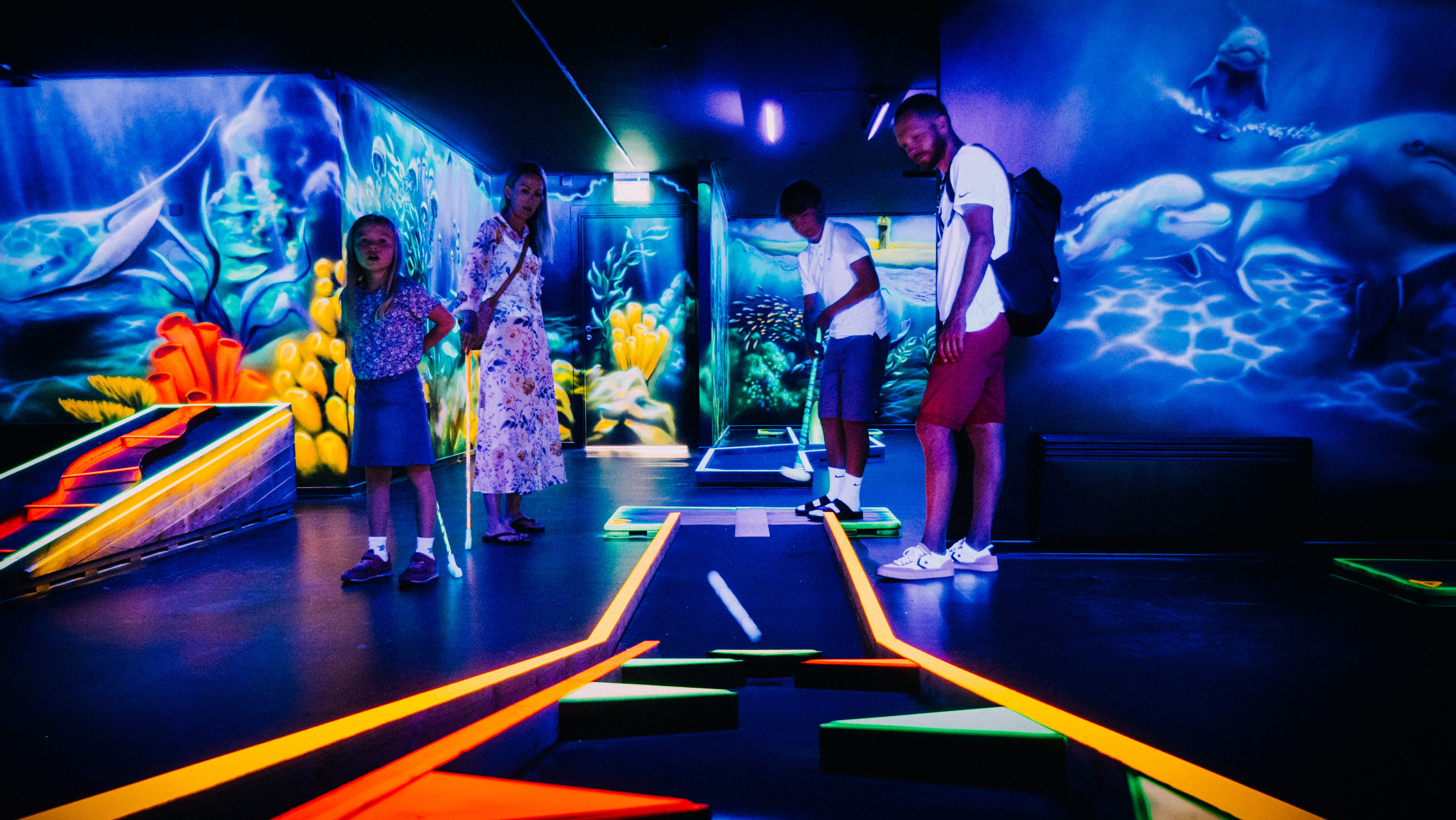 Book en badmintonbane eller test jeres færdigheder i minigolf på vores Black Light minigolfbane. Prøv klatrevæggen, fitnesscentret eller spil bordtennis på et af de fire borde i sportshallen.