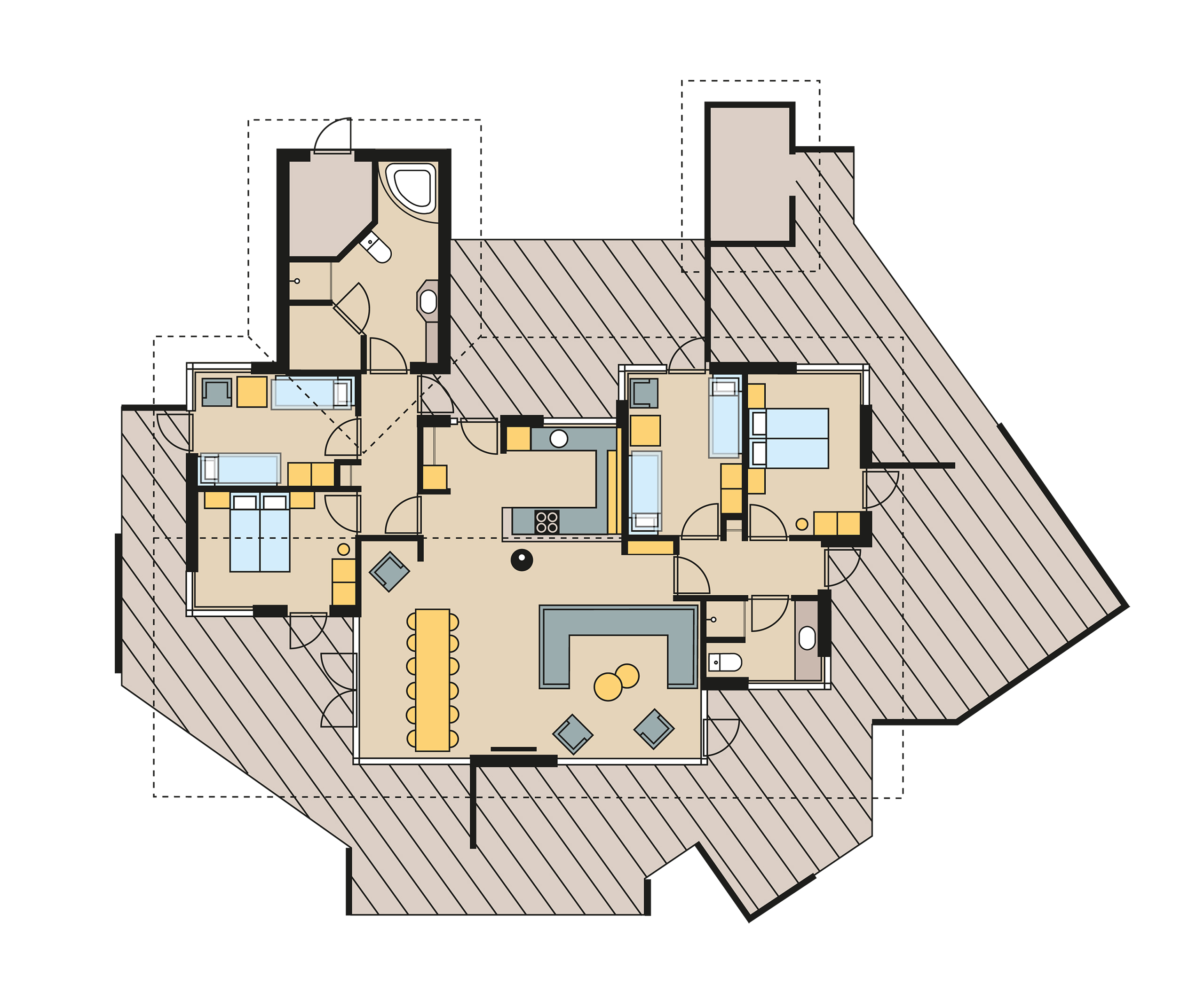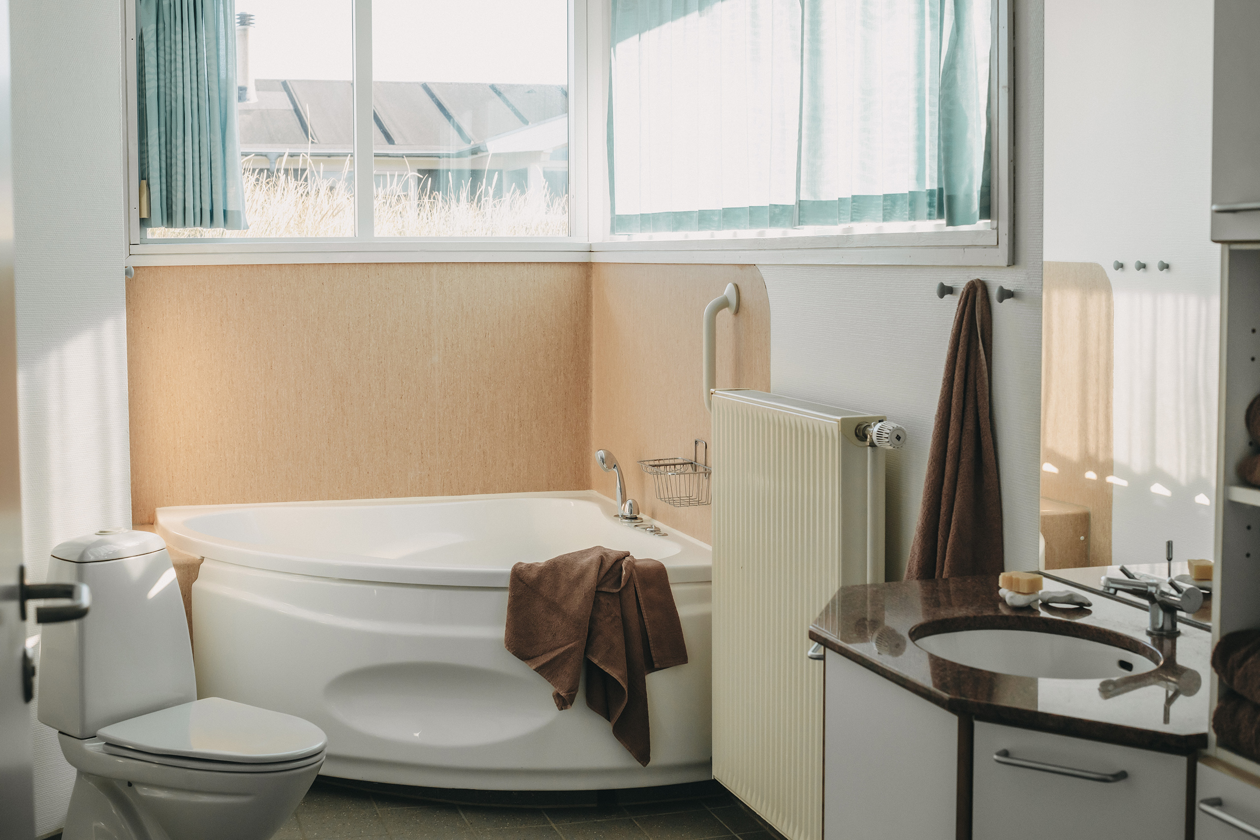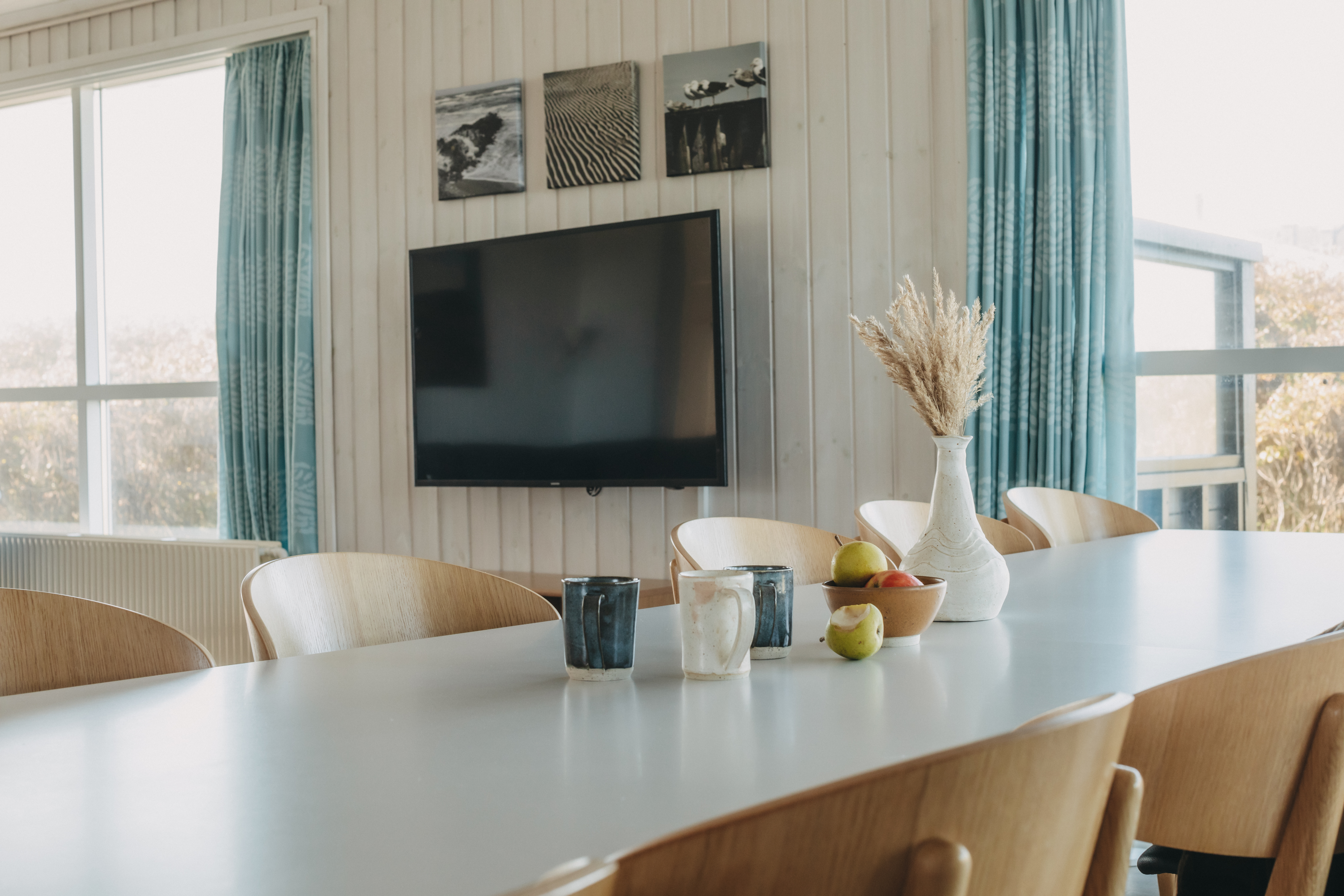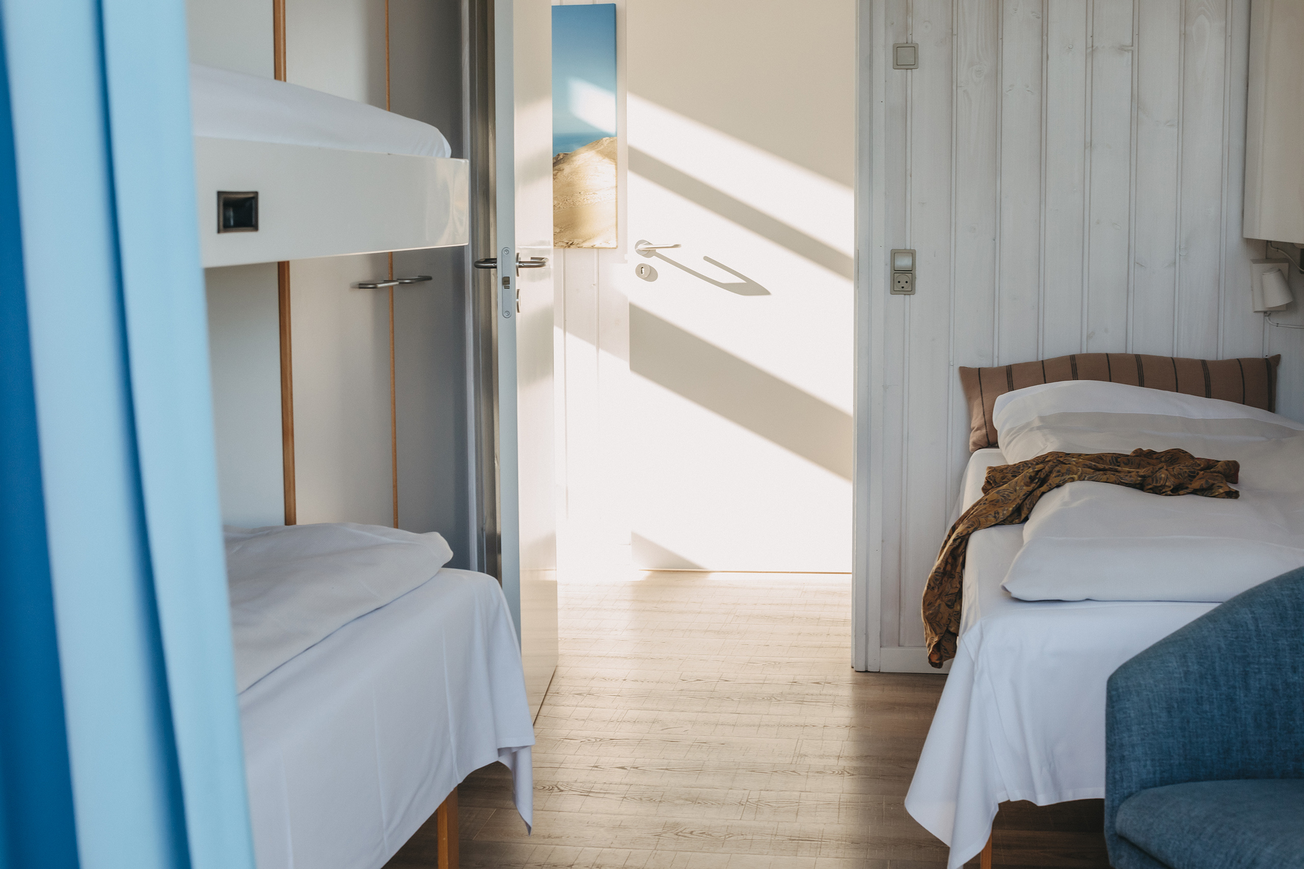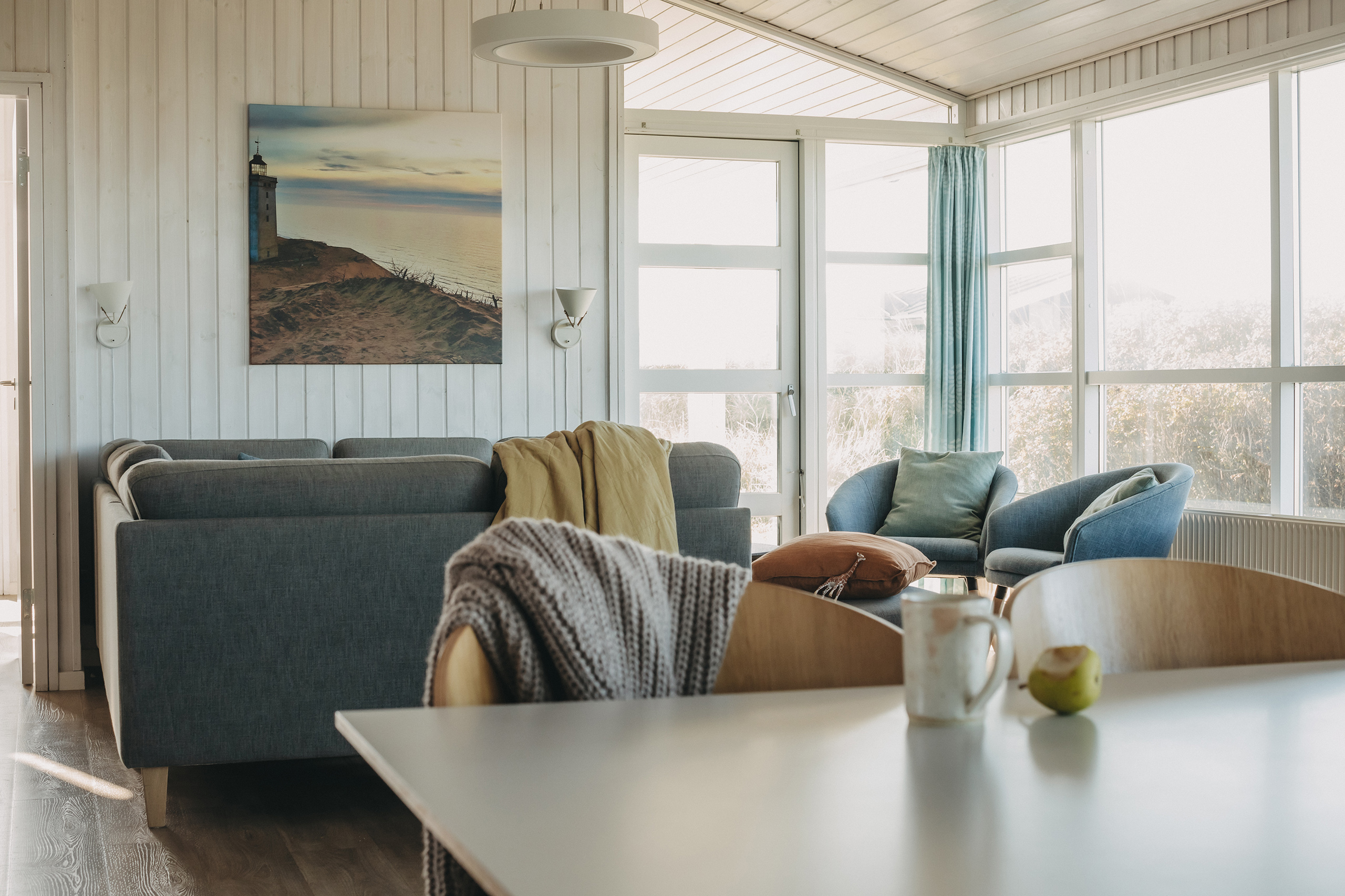 Ferieboligen med plads til nærvær og samvær. Sengepladserne er fordelt på 4 værelser, hvoraf 2 værelser er med dobbeltsenge og 2 med enkelt- og vægthængte senge. Ferieboligen har 2 badeværelser. Det ene med spabad og sauna. Alle kan samles i det hyggelige køkkenalrum eller på den store, delvist overdækkede terrasse, som er et ideelt samlingspunkt. Hvis vejret ikke arter sig, inviterer brændeovnen til hygge i stuen.