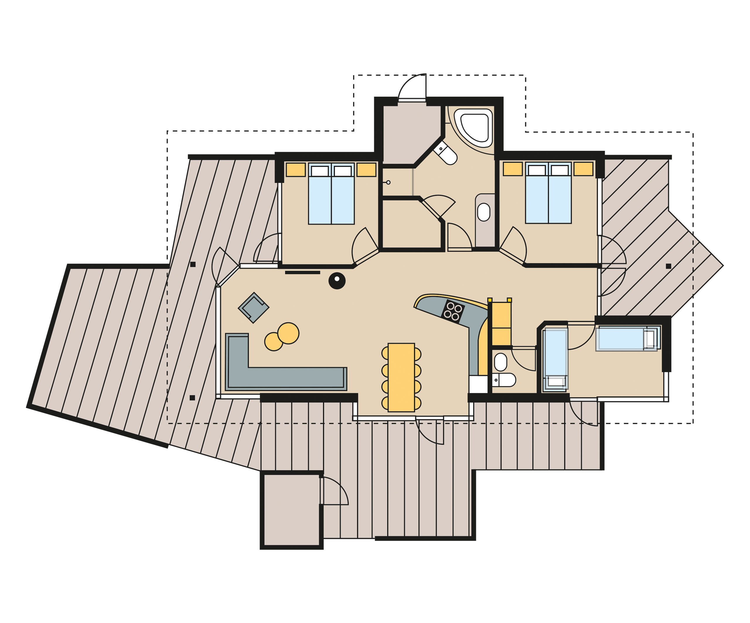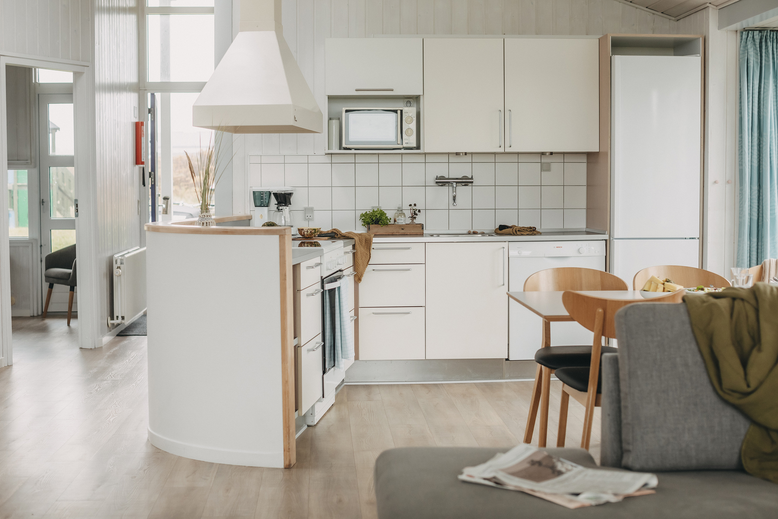 Ferieboligen, som indbyder til samvær med familie og venner. Sengepladserne er fordelt på 3 værelser, hvoraf 2 er med dobbeltsenge og det tredje er med 4 sengepladser, hvoraf de to er væghængte senge. Ferieboligen har et gæstetoilet samt et badeværelse med spabad og sauna. Den store, delvist overdækkede terrasse er et ideelt samlingspunkt, når vejret er godt - ellers kan I lune jer foran den knitrende brændeovn.